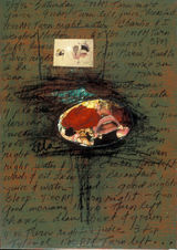 The Tacia Retablos is a series of thirty-three small paintings on tin. Their form is inspired by small folk paintings of Mexico also painted on tin and often referred to as ex votos. They recount miracles and blessings offering visible thanks for spiritual gifts.